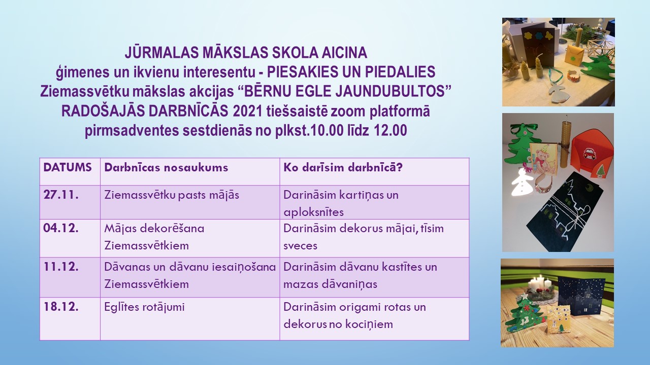 PIETEIKŠANĀS NOSLĒGUSIES! JŪRMALAS MĀKSLAS SKOLA pateicas par ļoti lielo interesi, piesakoties Ziemassvētku mākslas akcijas “BĒRNU EGLE JAUNDUBULTOS” RADOŠAJĀM DARBNĪCĀM 2021 tiešsaistē zoom platformā.