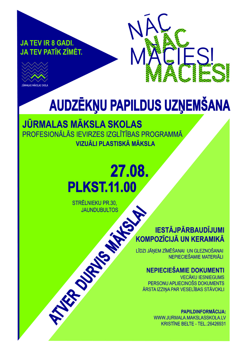 27. 08. plkst.11.00 notiks audzēkņu papildus uzņemšana Jūrmalas Mākslas skolas profesionālās ievirzes programmā VIZUĀLI PLASTISKĀ MĀKSLA.