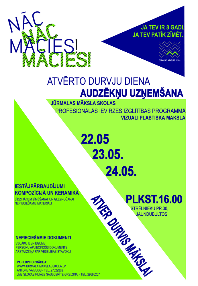 Par uzņemšanu Jūrmalas Mākslas skolā no 8, kā arī 9- 12 gadu vecuma sīkāk lasi šeit: