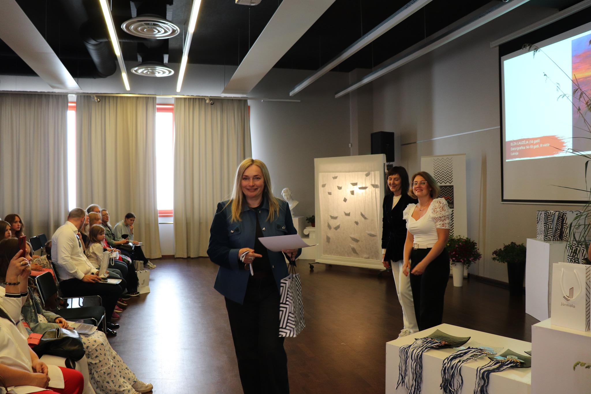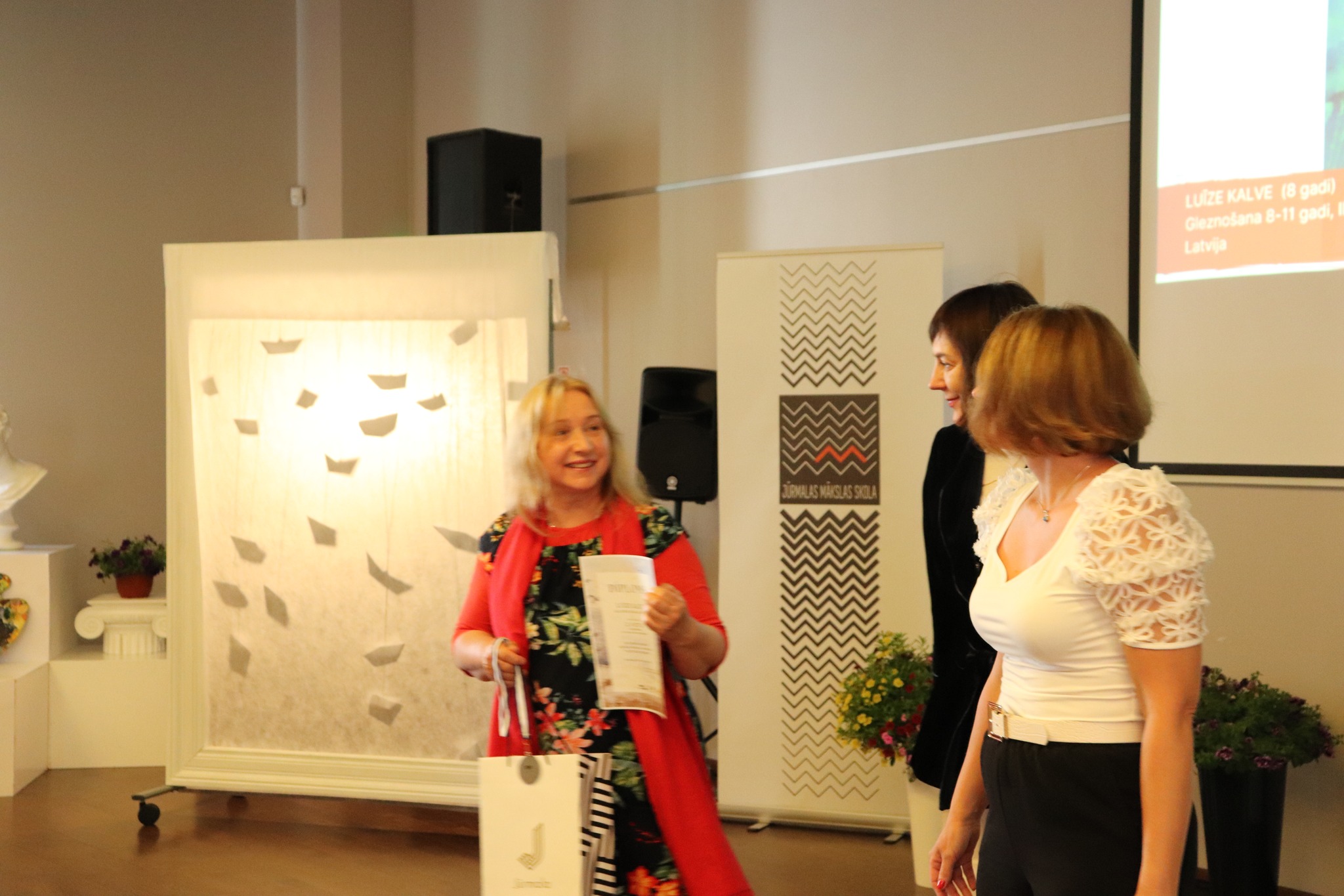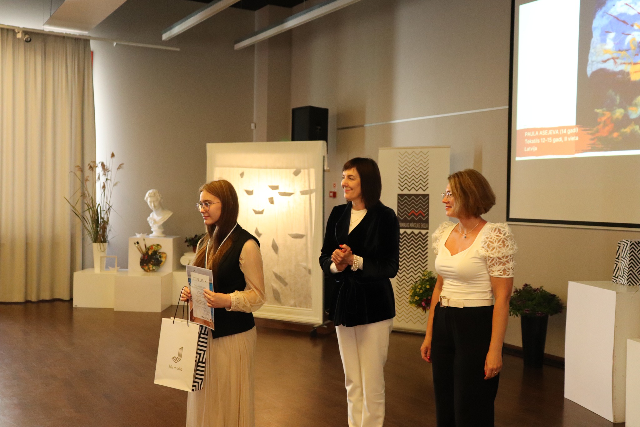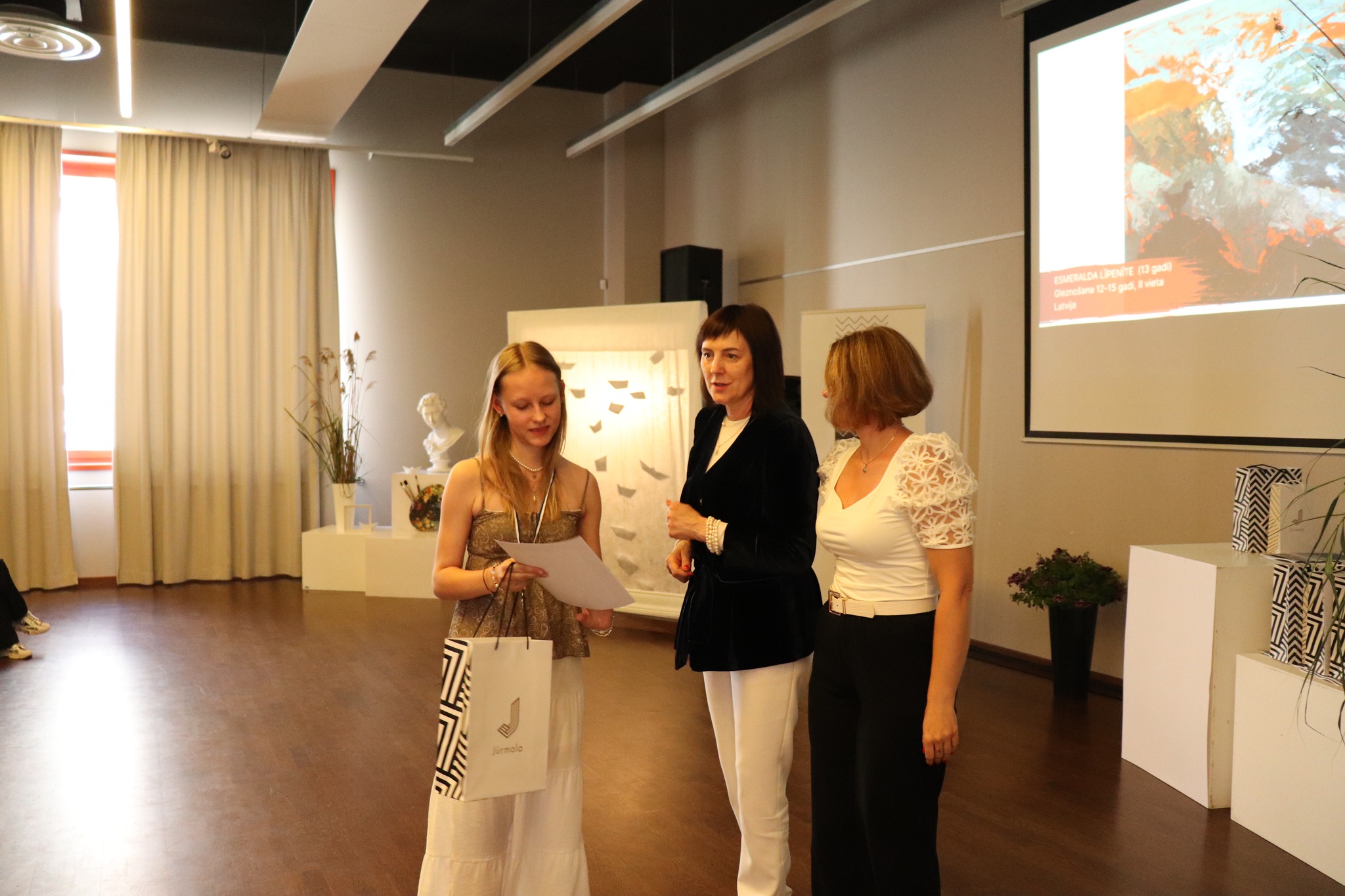 Laureātus sveica un balvas pasniedza Jūrmalas domes priekšsēdētāja Rita Sproģe, Latvijas Nacionālā kultūras centra tautas lietišķās mākslas eksperte Linda Rubena, konkursa žūrijas pārstāve, Tukuma Mākslas skolas direktores vietniece Kristīne Belte, Jūrmalas mākslas skolas projektu vadītāja Dace Starka. Dzīvu, atraktīvu muzikālo priekšnesumu sniedza vokālās studijas "Knīpas un knauķi" lieliskie dziedātāji savas vadītājas, vienlaikus Jūrmalas Mākslas skolas direktores Sanitas Sējānes vadībā. Mīļie konkursa dalībnieki, jaunie mākslinieki, sveicam ikvienu un lepojamies ar jums! Balvas vēl ceļos uz tālām zemēm, bet izstāde ir skatāma Jūrmalas Mākslas skolas izstāžu zālē Strēlnieku prospektā 30, K-2 līdz 20. augustam.